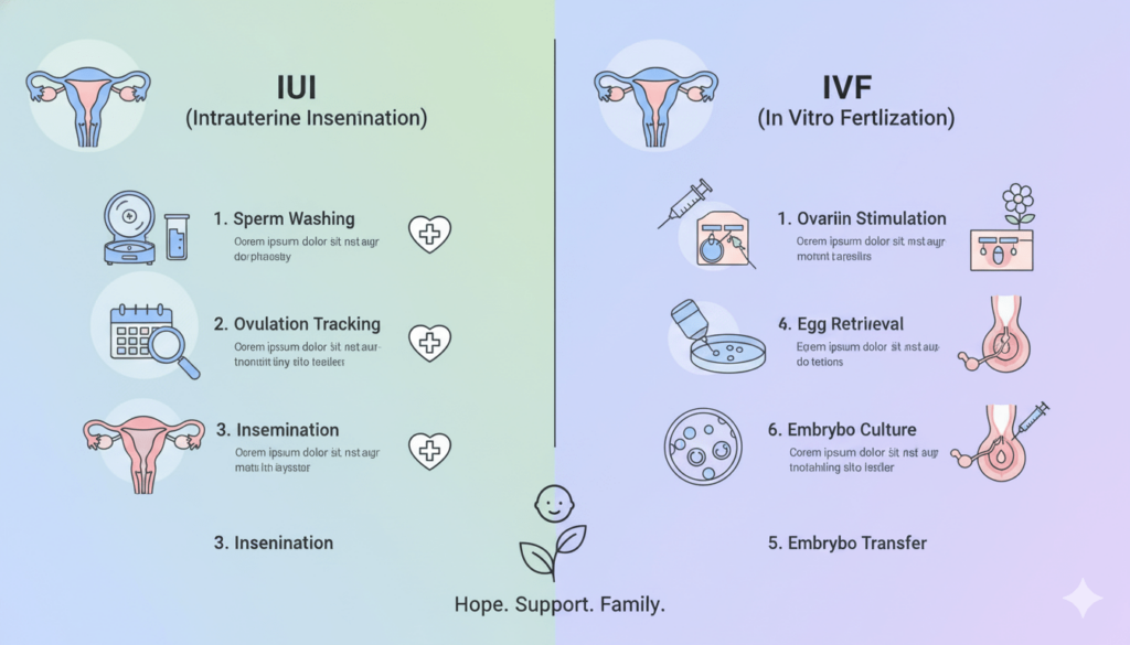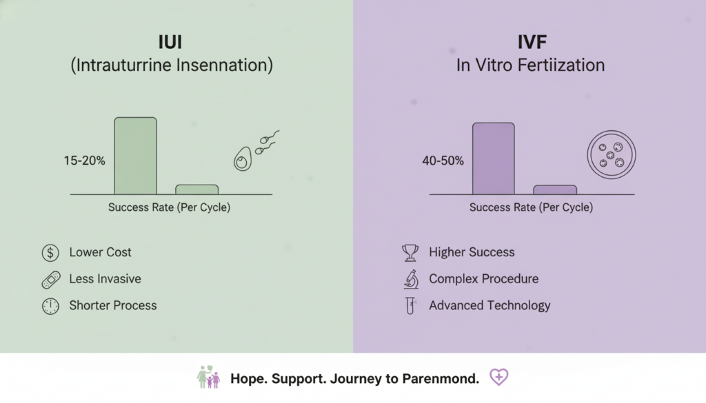 IUI is simple and useful for mild fertility problems, while IVF provides higher success for more complex conditions.